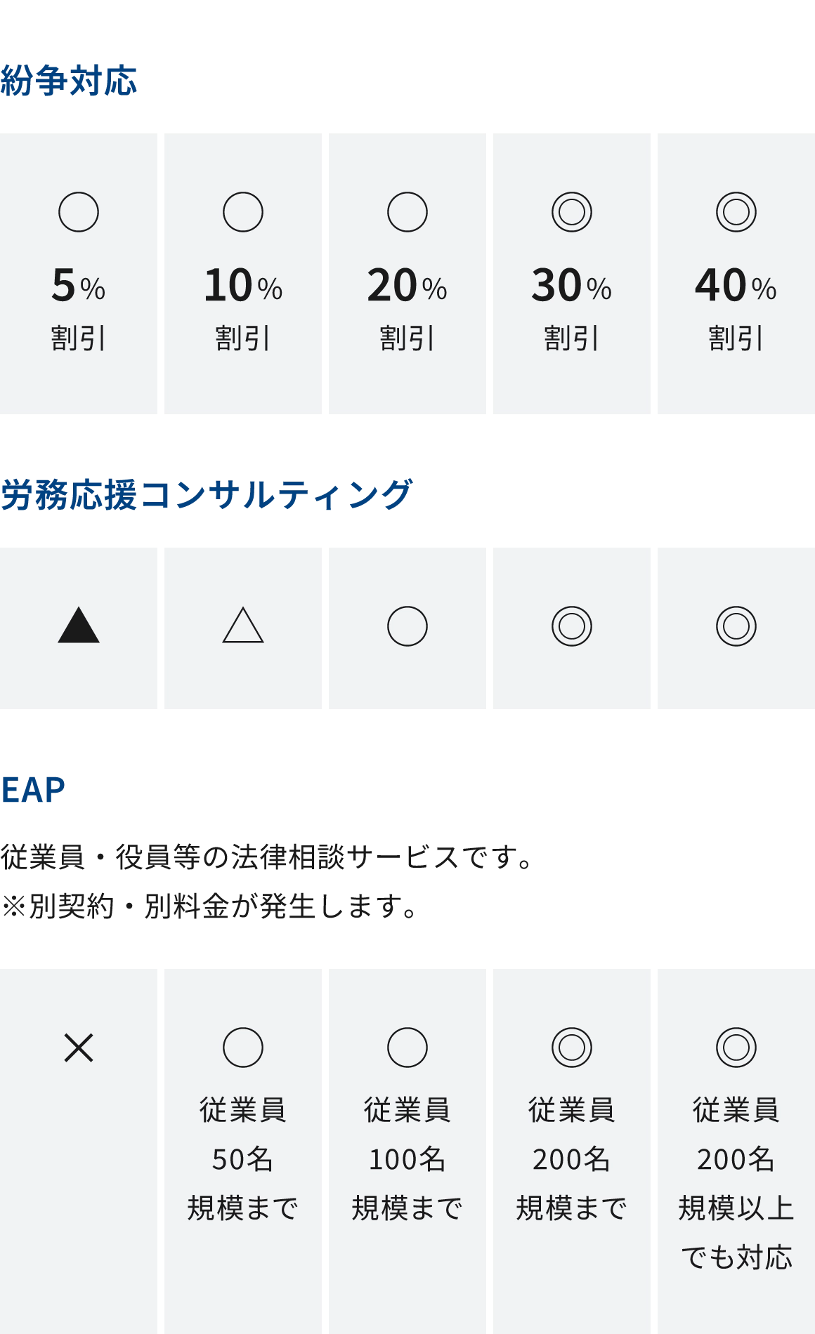 顧問契約のオプションとして、企業の従業員の方からの法律相談等を実施するEAP(従業員支援プログラム)をご用意しています。サービスの費用については、以下のページをご覧ください。