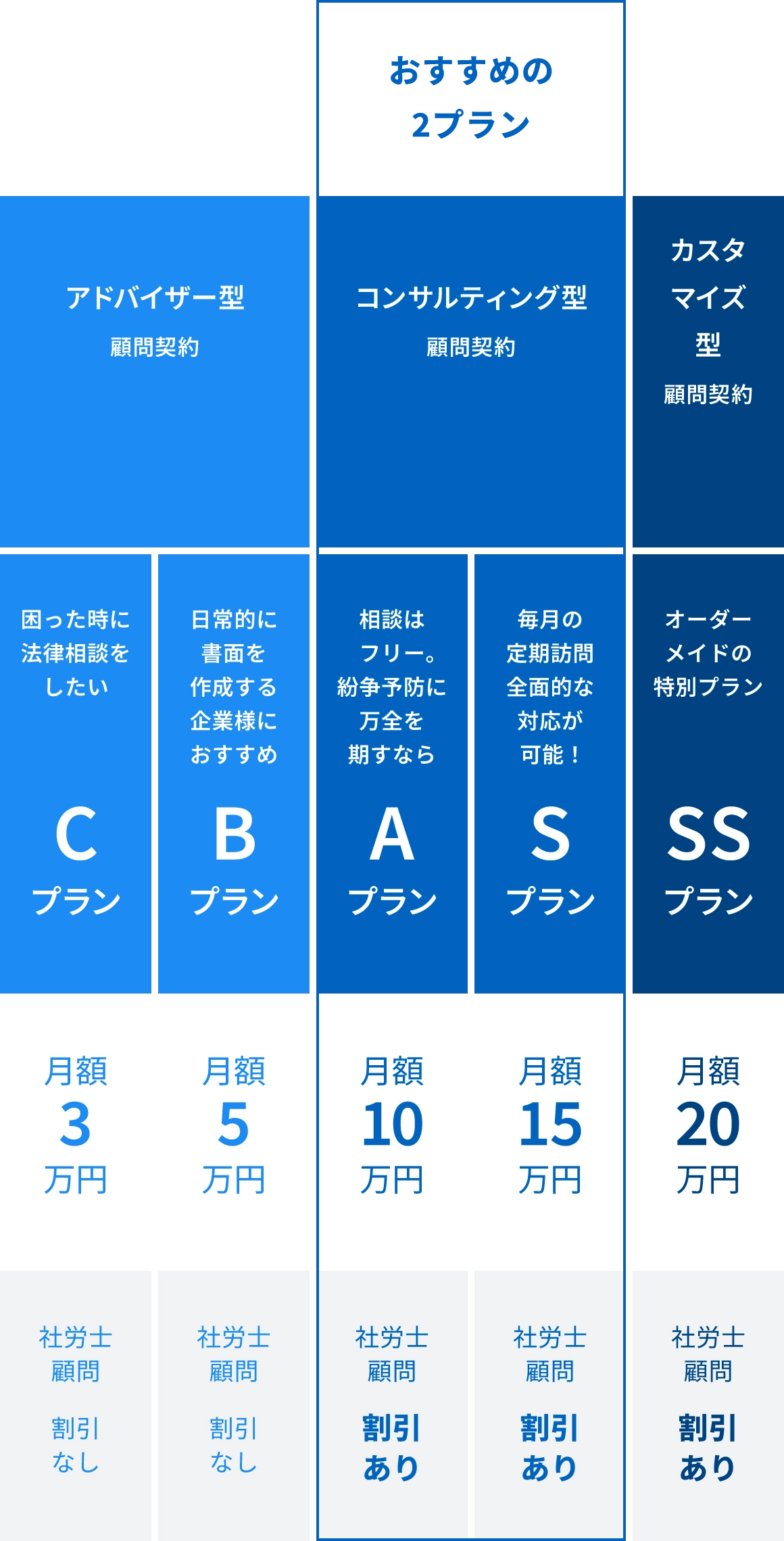 すべての顧問契約プランにおいて、社労士サービスのご利用が可能です。