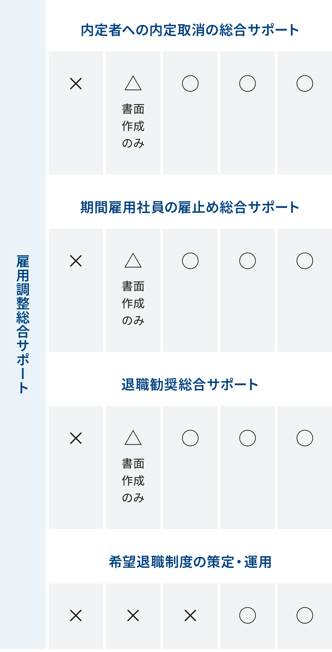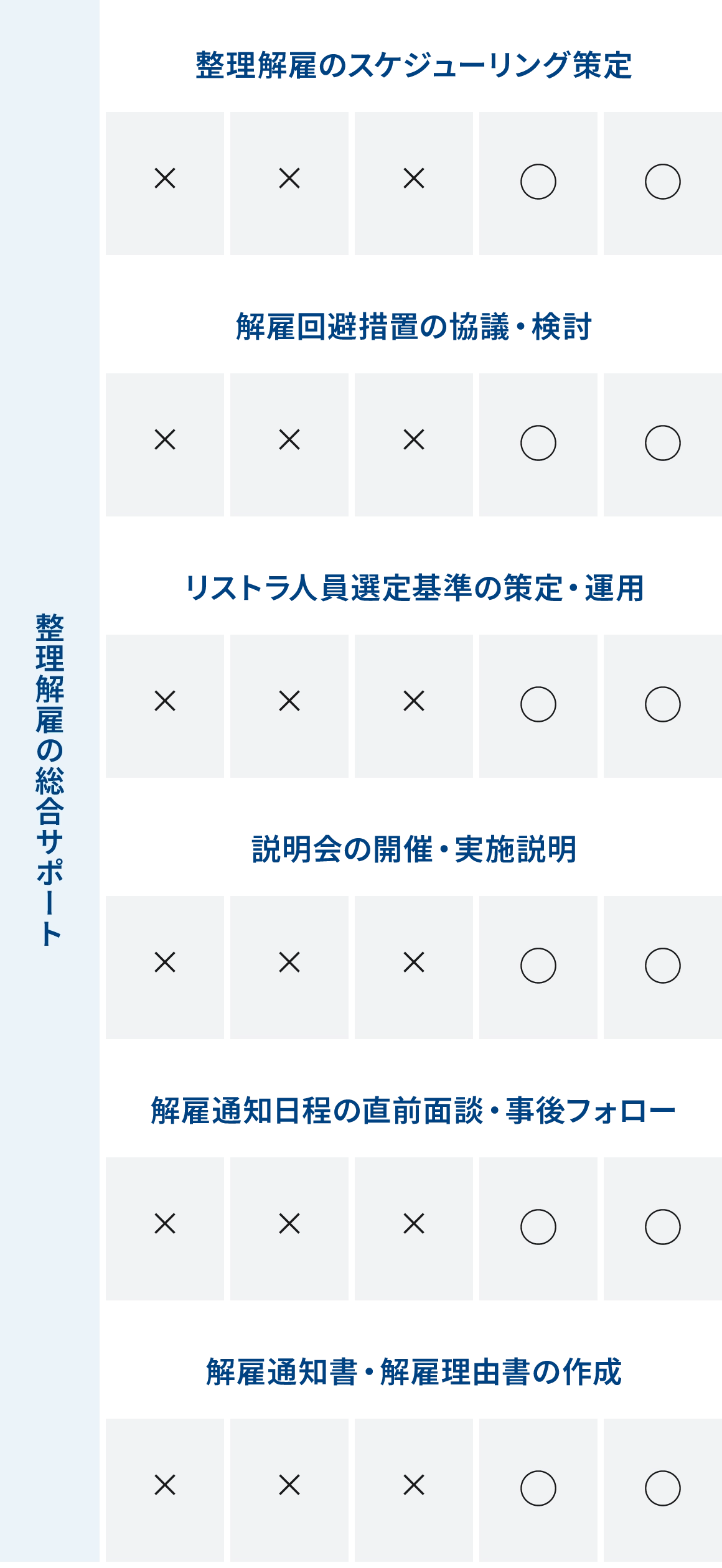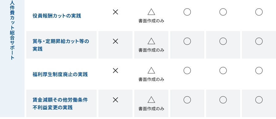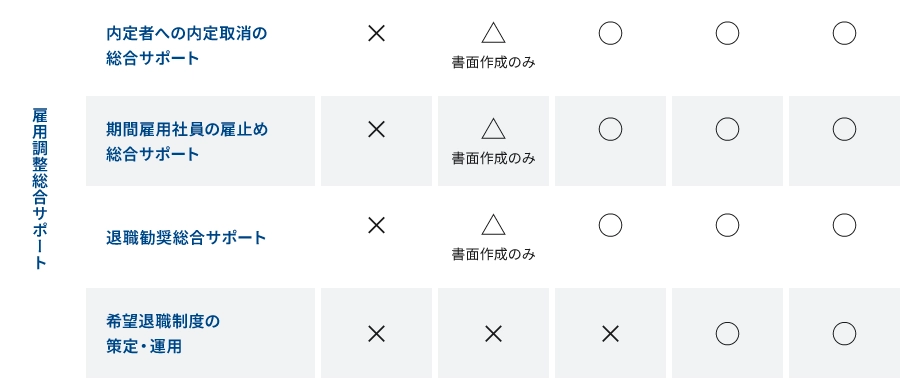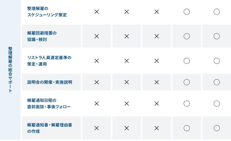 解雇回避措置の検討をはじめ、基準策定からそのプロセスを踏んでいくことは、専門家の力なくして実践することは極めて困難です。整理解雇を目指した全ての手続きをフォローします。