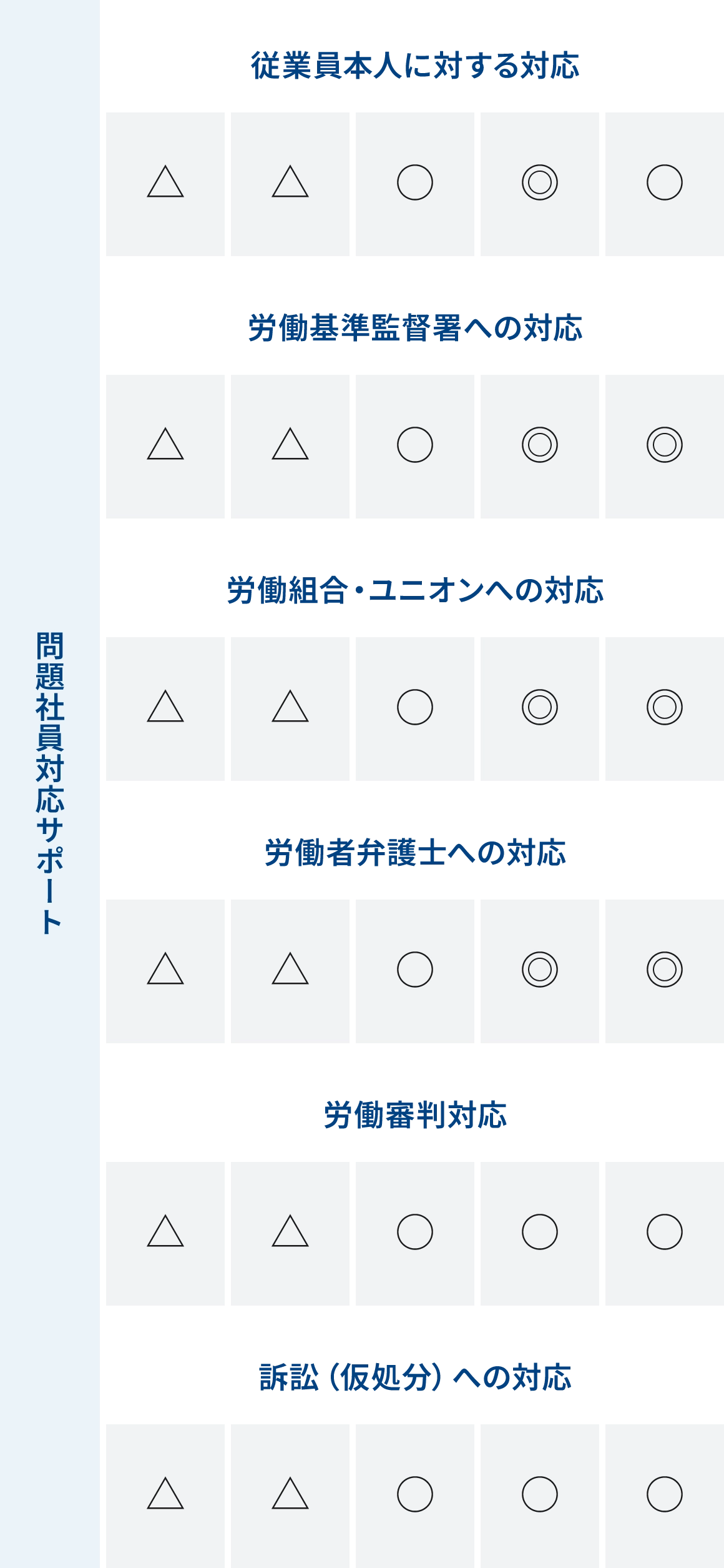 労務管理の分野・ステージごとに応じて、労働専門弁護士がどのようなお手伝いができるのかをメニュー化しました。