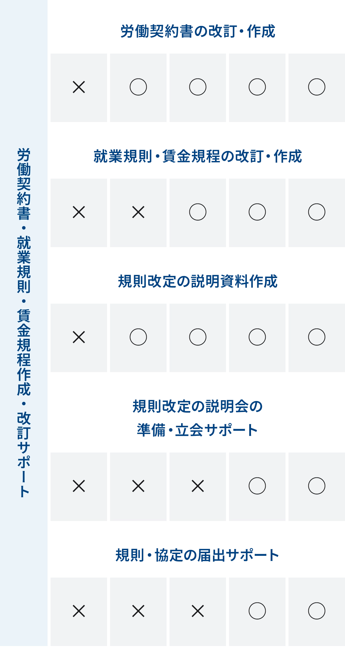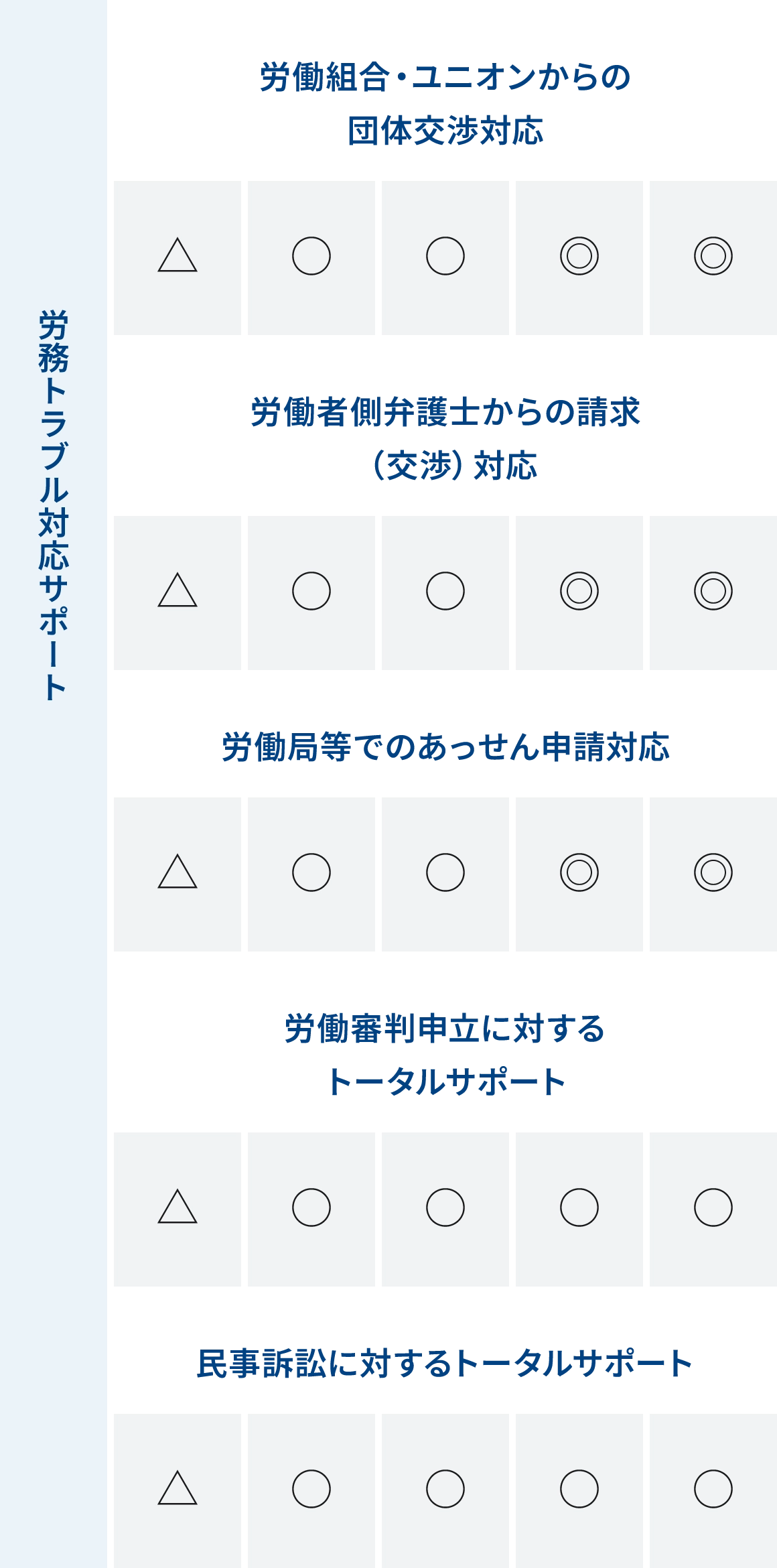 労務管理の分野・ステージごとに応じて、労働専門弁護士がどのようなお手伝いができるのかをメニュー化しました。