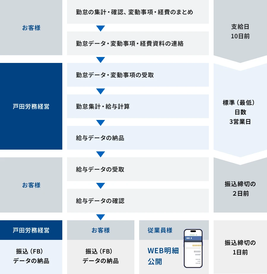 給与計算業務のアウトソーシングだけでなく、会社で行った給与計算データに対するWチェックの業務や、給与計算クラウドシステムでの設定内容が就業規則や賃金規程・実際の働き方と整合性が取れている事の確認など、アウトソーシング以外の業務も取り扱っております。